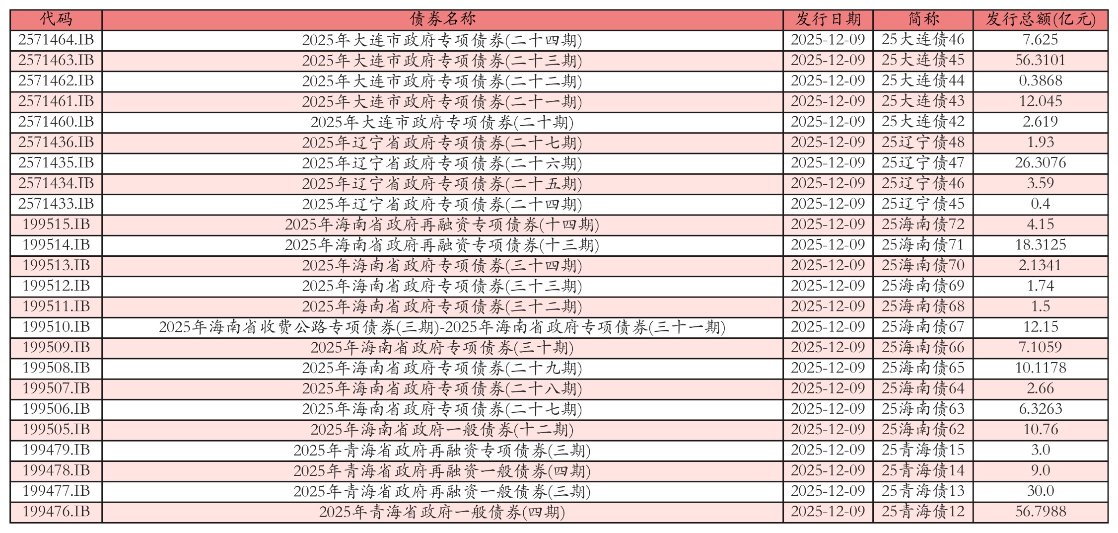 南财智讯12月9日电,南财金融终端数据显示,2025年12月9日全国共发行24只地方政府债,共计286.9689亿元。其中配资炒股app配资炒股app,政府一般专项债发行4只,共106.5588亿元;地方政府专项债发行20只,共180.4101亿元。各地方政府所发行债券中,25大连债45、25海南债71、25辽宁债47、25青海债12发行规模靠前,发行金额分别为56.3101亿元、18.3125亿元、26.3076亿元、56.7988亿元。投标方面,各地方政府所发行债券中,25大连债45、25海南债71、25辽宁债47、25青海债12全场中标倍数靠前。其中:25大连债45全场中标倍数为21.9,全场中标利率为2.49%,边际倍数为2.39;25海南债71全场中标倍数为20.95,全场中标利率为2.05%,边际倍数为2.31;25辽宁债47全场中标倍数为27.63,全场中标利率为2.49%,边际倍数为4.41;25青海债12全场中标倍数为21.63,全场中标利率为2.08%,边际倍数为2.07。今日发行地方政府债详情如下表: